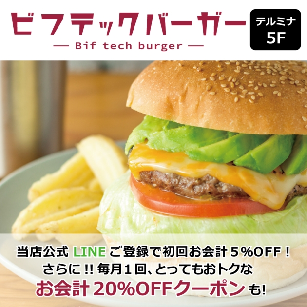 テルミナ5F「ビフテックバーガー」では、公式LINEの会員募集中です!