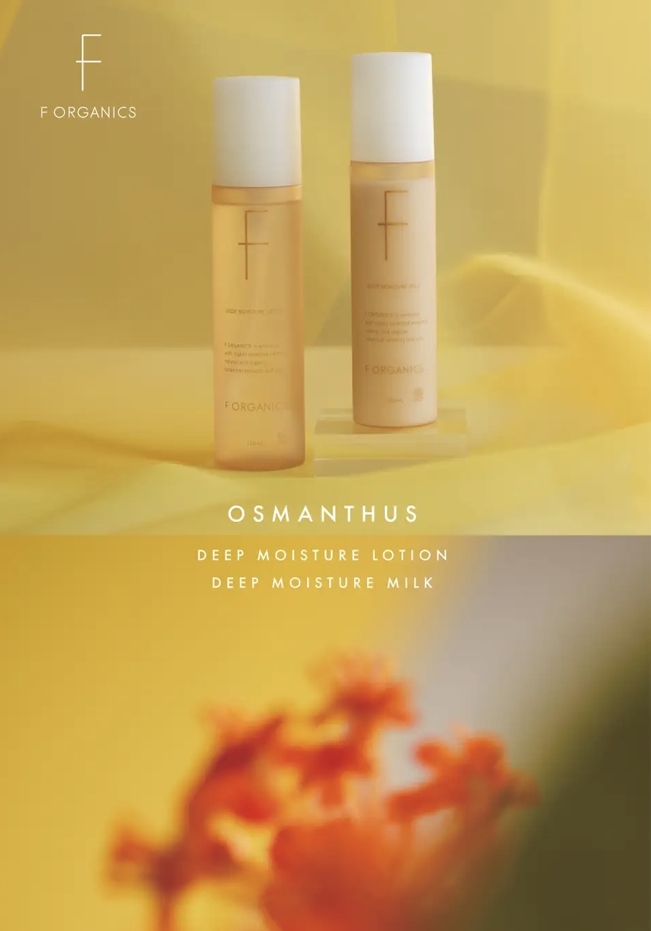 F ORGANICSからは、人気のディープモイスチャーローション・ミルクがテクスチャーや機能性はそのままに、秋の訪れを告げる繊細かつ可憐な“オスマンサスの香り”と限定パッケージで登場。ブランド独自の奥深く上品な香りを、コスモスオーガニック認証処方で実現しました。
