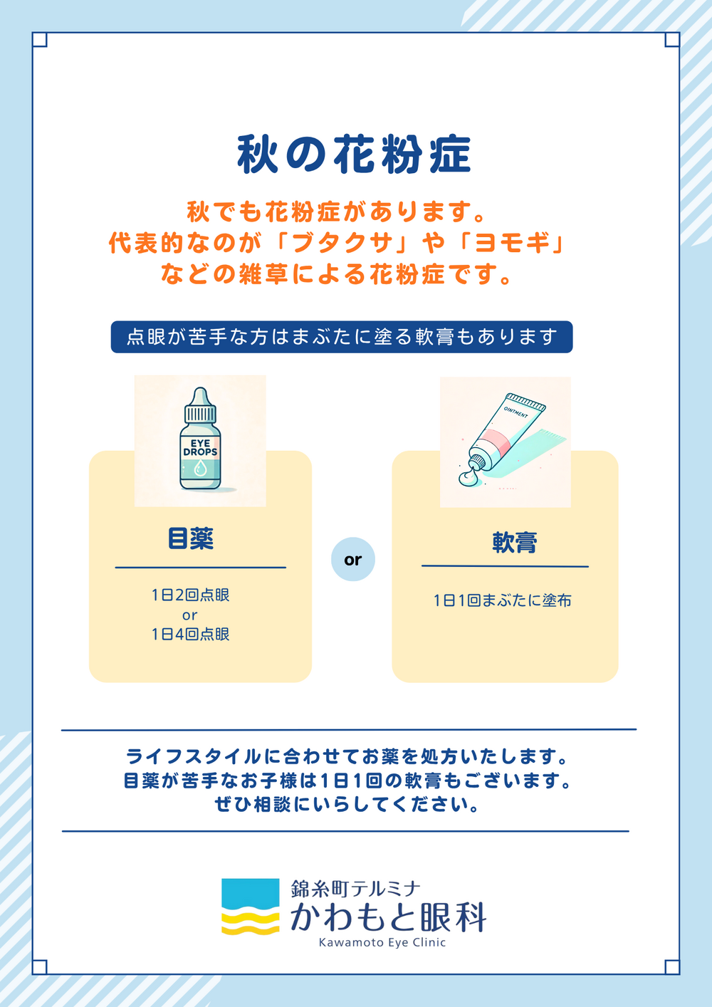 かわもと眼科 カワモトガンカ 4F Shop News 2025-10-21 秋の花粉症 秋の花粉症以外にも、秋にアレルギーが悪化する理由があります。 それが「ダニ」です。 9月~11月は、夏の繁殖期で増えたダニの大量死が重なることで、これらのアレルゲン量が年間で最も高くなるため、「ダニアレルギーのトップシーズン」と呼ばれるわけです。 目のかゆみや充血が1週間以上続く・めやにが多く出るなどの症状がある場合には、 お早目に眼科を受診しましょう。 update:10/21(火) 前の記事 一覧