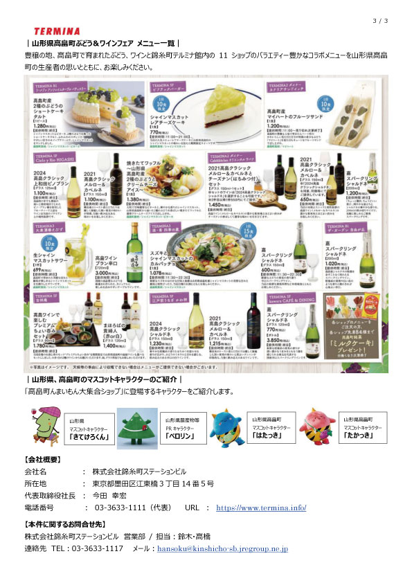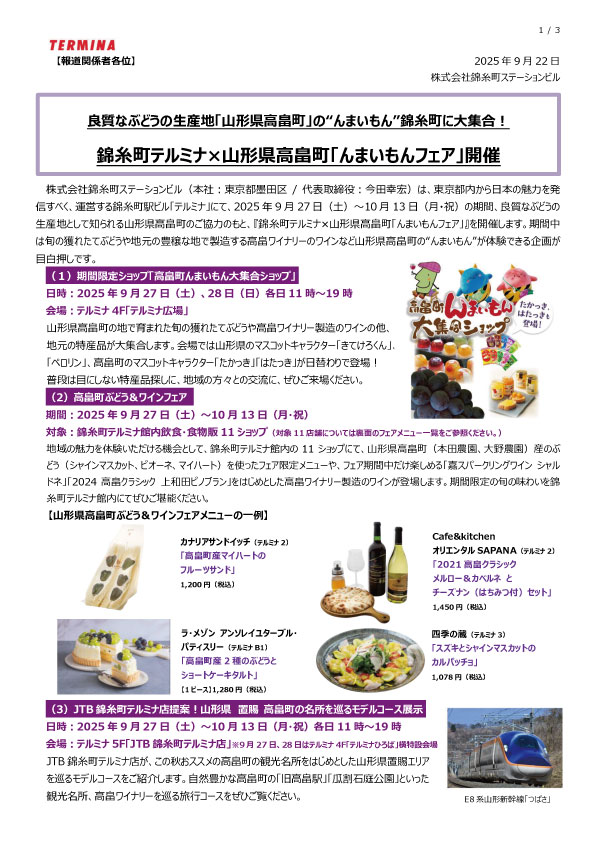 2025-09-21 良質なぶどうの生産地「山形県高畠町」の“んまいもん”錦糸町に大集合! 錦糸町テルミナ×山形県高畠町「んまいもんフェア」開催 ★PDFはこちら★ update:9/21(日) 前の記事 次の記事 一覧