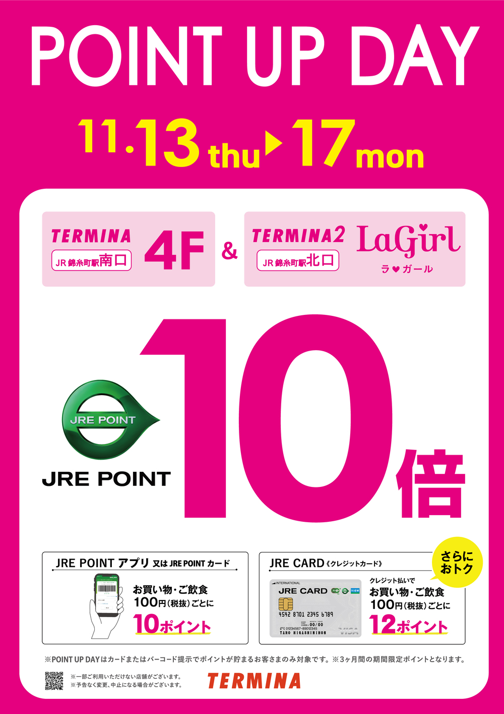 11月13日(木)~11月17日(月祝)の期間、テルミナ4Fとテルミナ2ラ・ガールにてJRE POINT 10倍DAYを開催します!