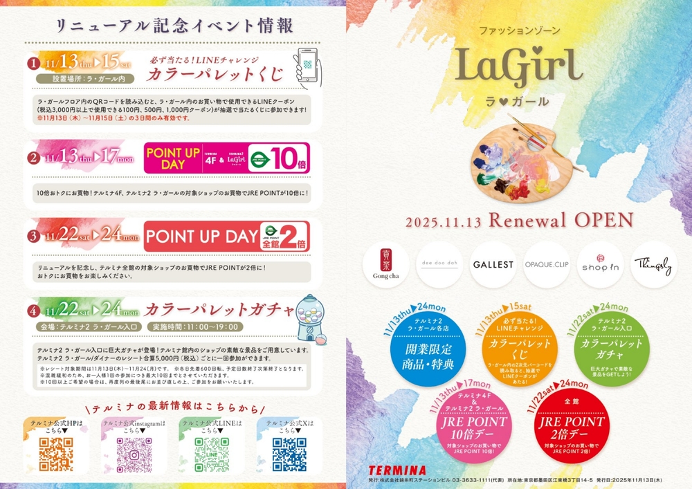 News ●Event 11/05(水)~11/24(月) テルミナ2 ラ・ガール リニューアルオープンのお知らせ テルミナ2ラ・ガールは、11月13日にリニューアルオープンします。 「Crafting a color palette」をコンセプトに、その日の気分に合わせて選べる、いろとりどりのショップが、あなたの毎日を特別に彩ります。 リニューアルオープンを記念して、JRE POINT10倍デーや巨大ガチャをはじめとしたイベントが盛りだくさん! PDF update:9/29(月) 前の記事 次の記事 一覧