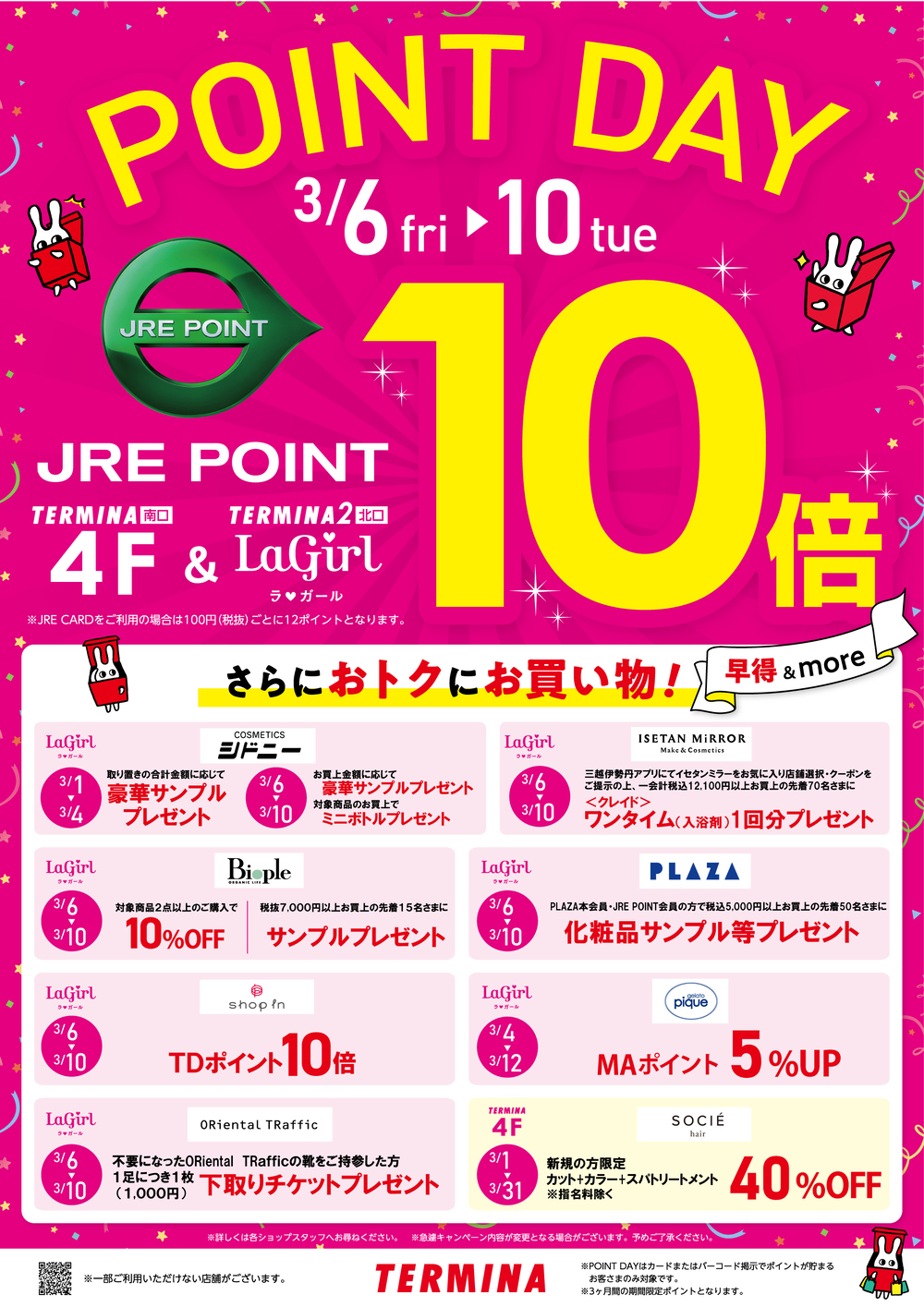 News ●Point Day 3/06(金)~3/10(火) 【早得 & more】テルミナ4F・テルミナ2ラガール限定 JRE POINT 10倍DAY!をさらにおトクに! 10倍デーをさらにおトクにするショップ特典が盛りだくさん! ぜひこのおトクな機会にお買いものをお楽しみください! update:2/27(金) 前の記事 次の記事 一覧