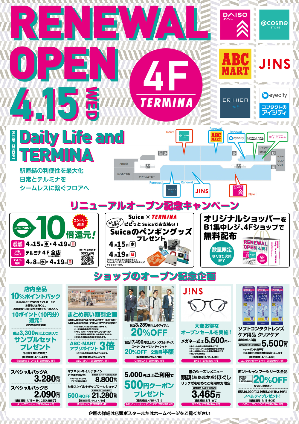 News ●Campaign 4/08(水)~4/19(日) テルミナ4F 2026年4月15日(水)にリニューアルオープン! テルミナ4Fは2026年4月15日(水)にリニューアルオープンいたします! リニューアルオープンを記念して様々なキャンペーンを開催いたいます。 詳細はプレスリリースをご確認ください。 PDFはこちら update:4/01(水) 前の記事 一覧